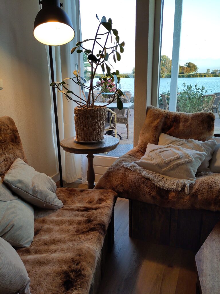 We hebben een fan-tas-tisch (gemeenschappelijk) terras pal áán het water en een heerlijke sfeervolle binnenruimte waar je de avond kunt doorbrengen (met een boek, een spelletje of een puzzel).