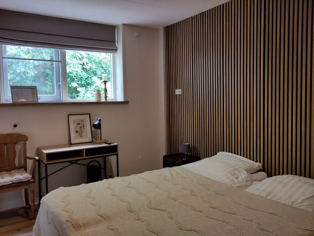 Je hebt in je (knusse, sfeervolle en 2 fijne opgemaakte (eenpersoons)bedden) kamer óf uitzicht op de zij-tuin óf uitzicht op het kabbelende water, je eigen badkamer, een flatscreen televisie en gratis wifi.