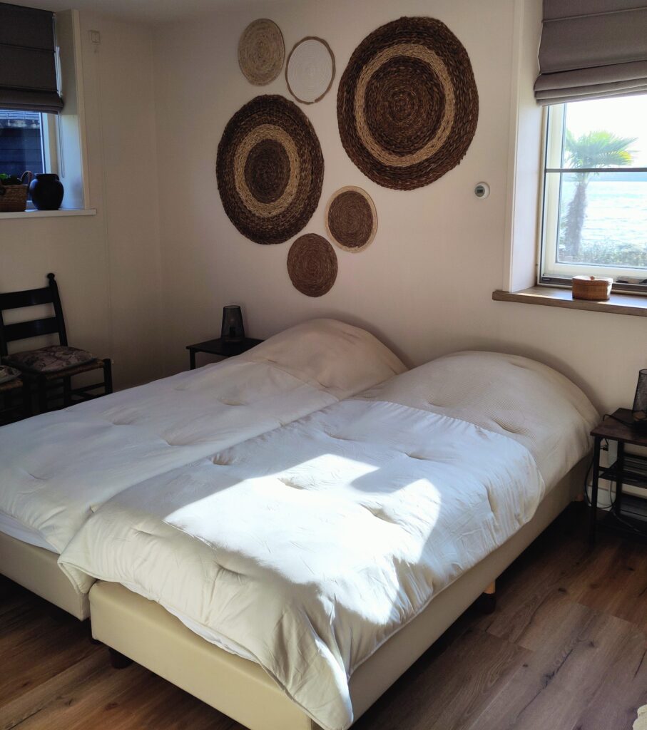 Je hebt in je (knusse, sfeervolle en 2 fijne opgemaakte (eenpersoons)bedden) kamer óf uitzicht op de zij-tuin óf uitzicht op het kabbelende water, je eigen badkamer, een flatscreen televisie en gratis wifi.